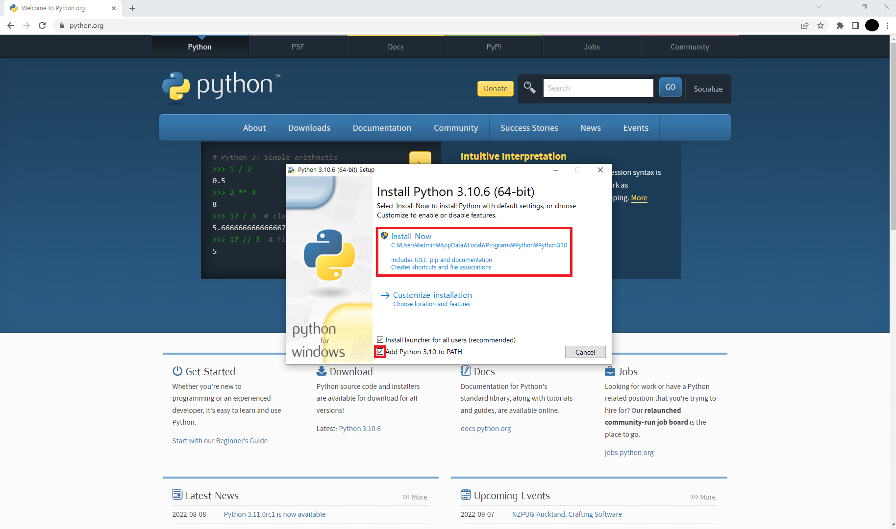 Add Python 3.10 to PATH를 체크하고 Install Now를 클릭하여 다운로드한다.