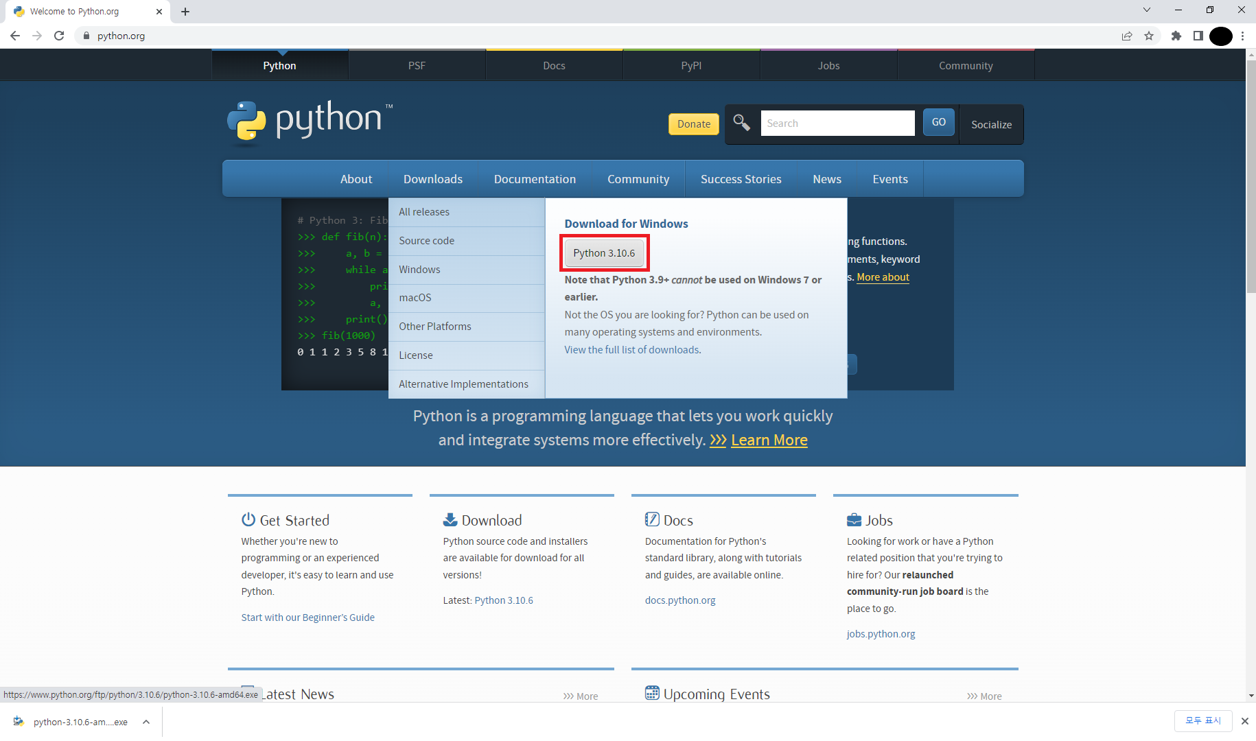 2. Downloads 아래 가장 최신 버전의 Python을 다운로드한다.
