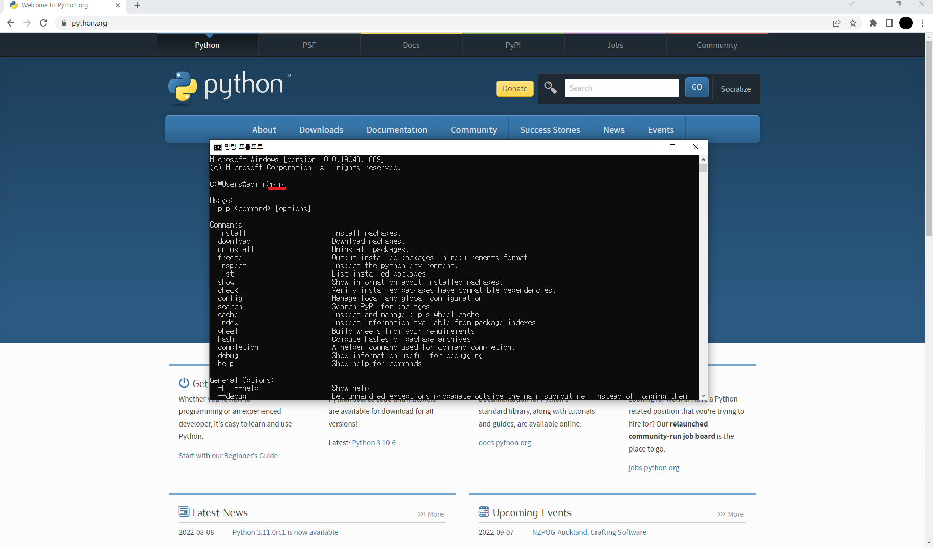'pip'를 입력한 후 아래와 같이 뜨면 제대로 설치가 된 것이다.