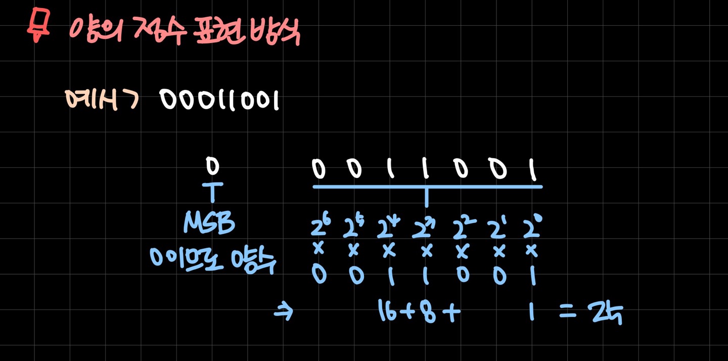 : 가장 왼쪽에 부호를 나타내는 비트(MSB) + 데이터 크기 나타내는 비트로 구성.