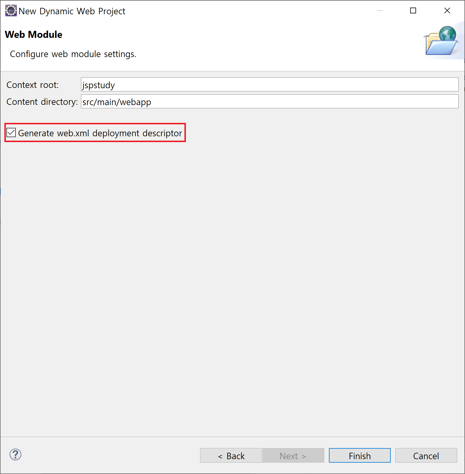 ⑤ Generate web.xml deployment descriptor 체크 후 finish.