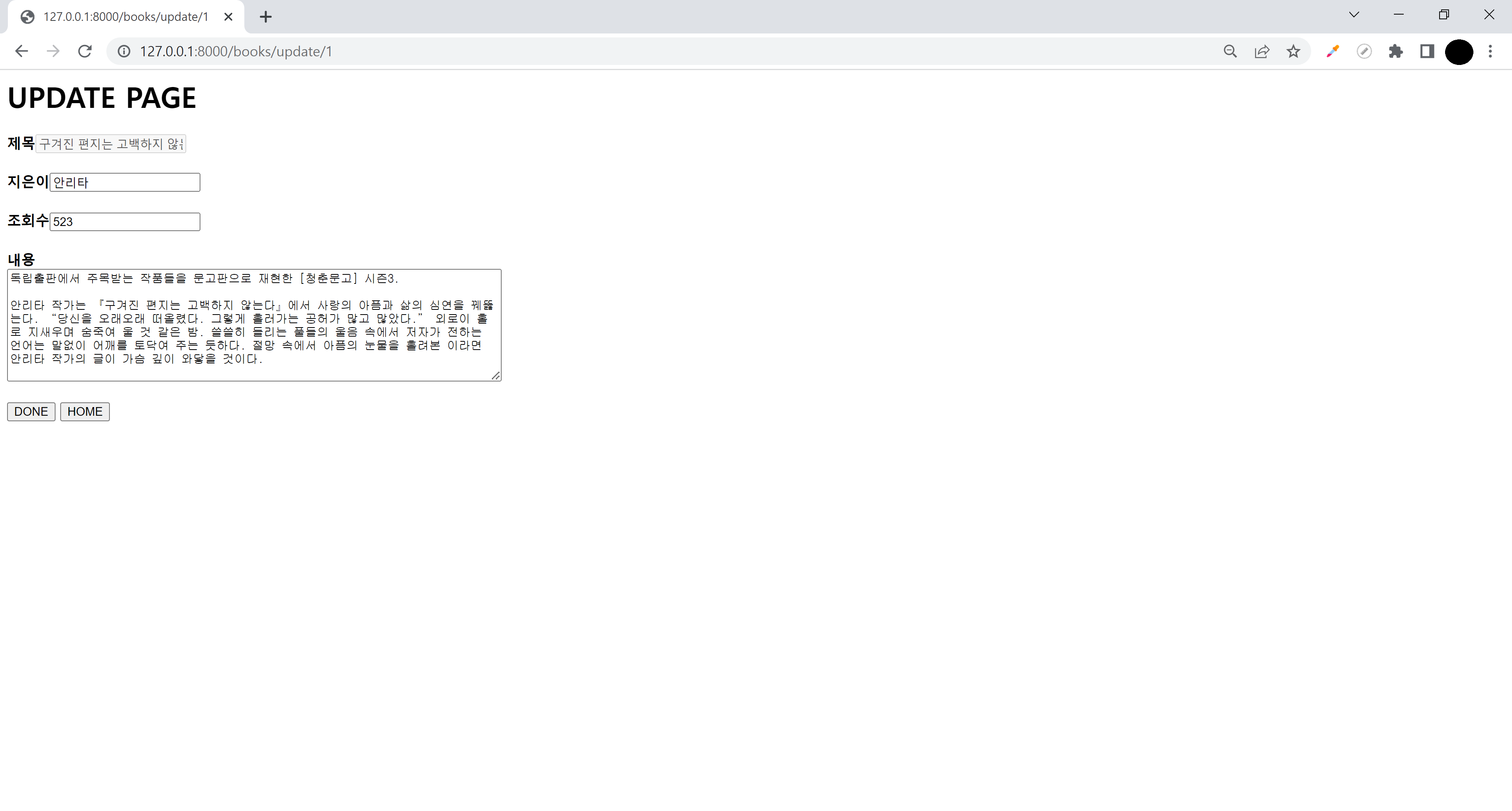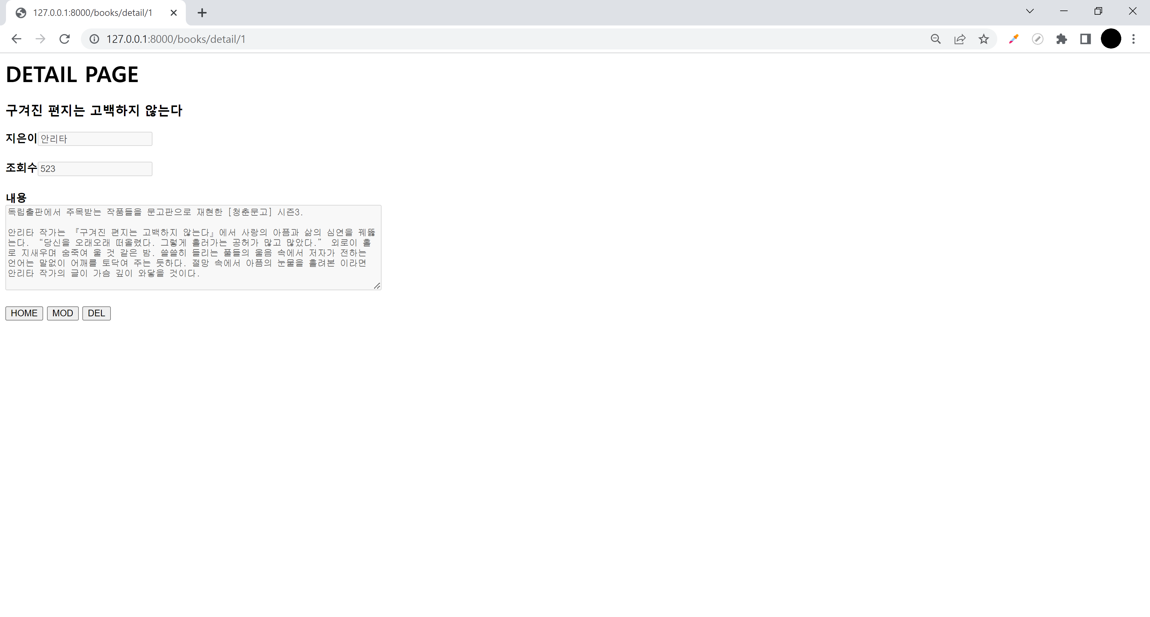 | [Django] DB 가져와서 CRUD(5) - 데이터 삭제하기(D) (0) | 2022.12.19 |
