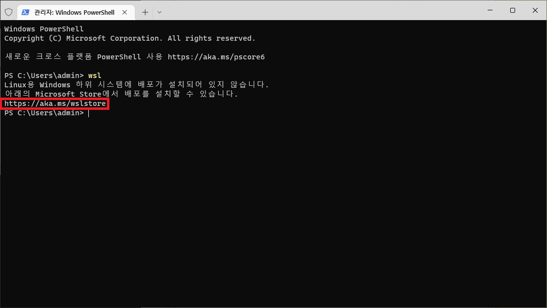 5. 재부팅 후 다시 Windows Terminal을 관리자 권한으로 실행하고, wsl을 입력한 후 아래 링크를 열어 설치한다.