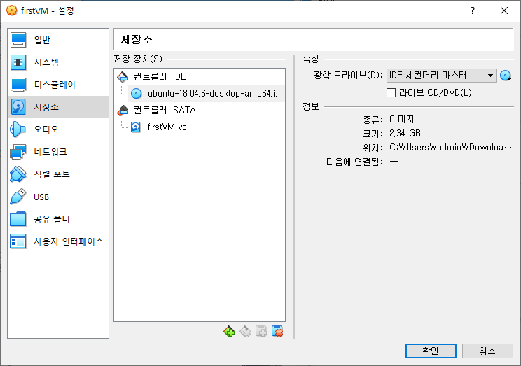 4. 저장소 > 광학 드라이브 : 다운받은 .iso로 설정.