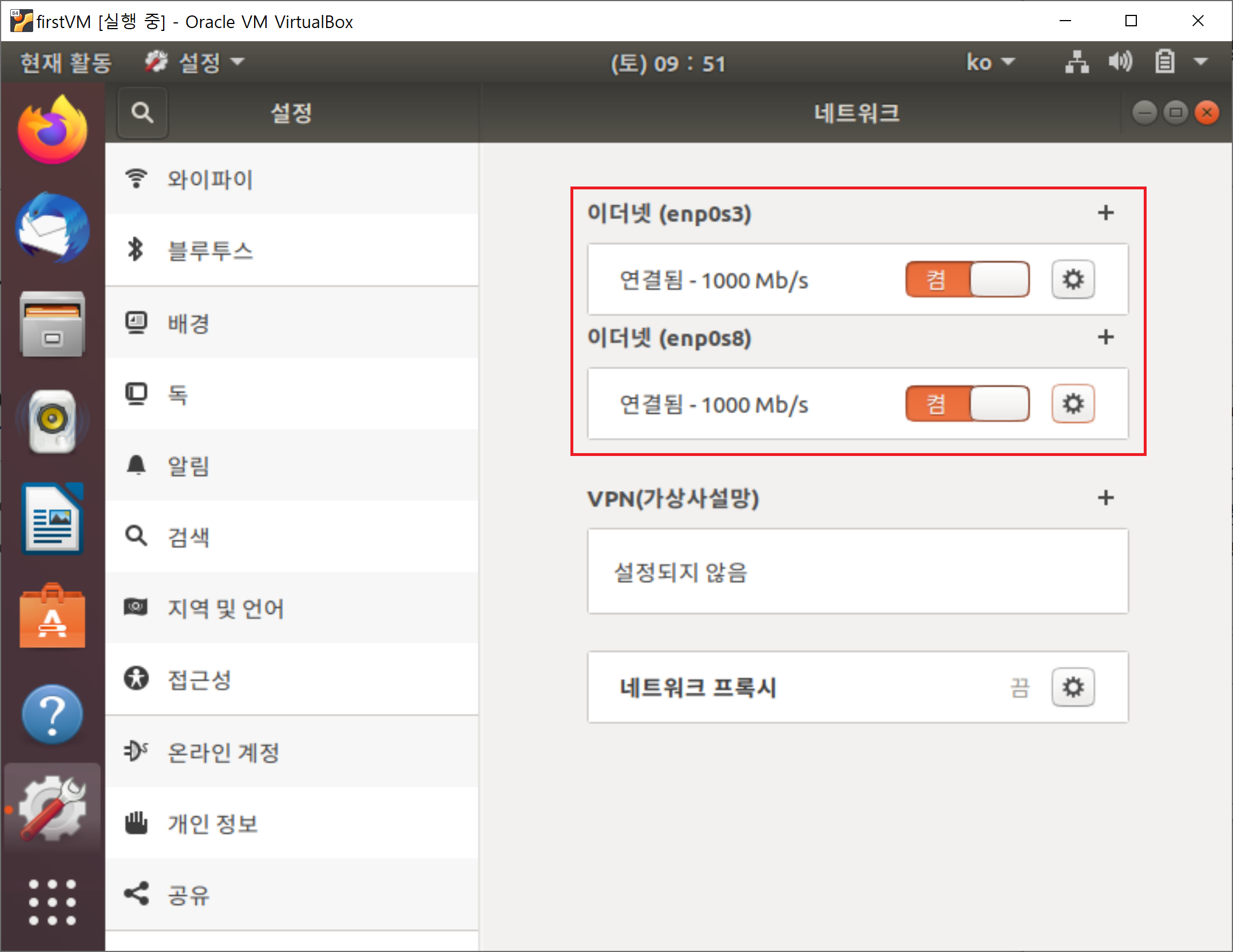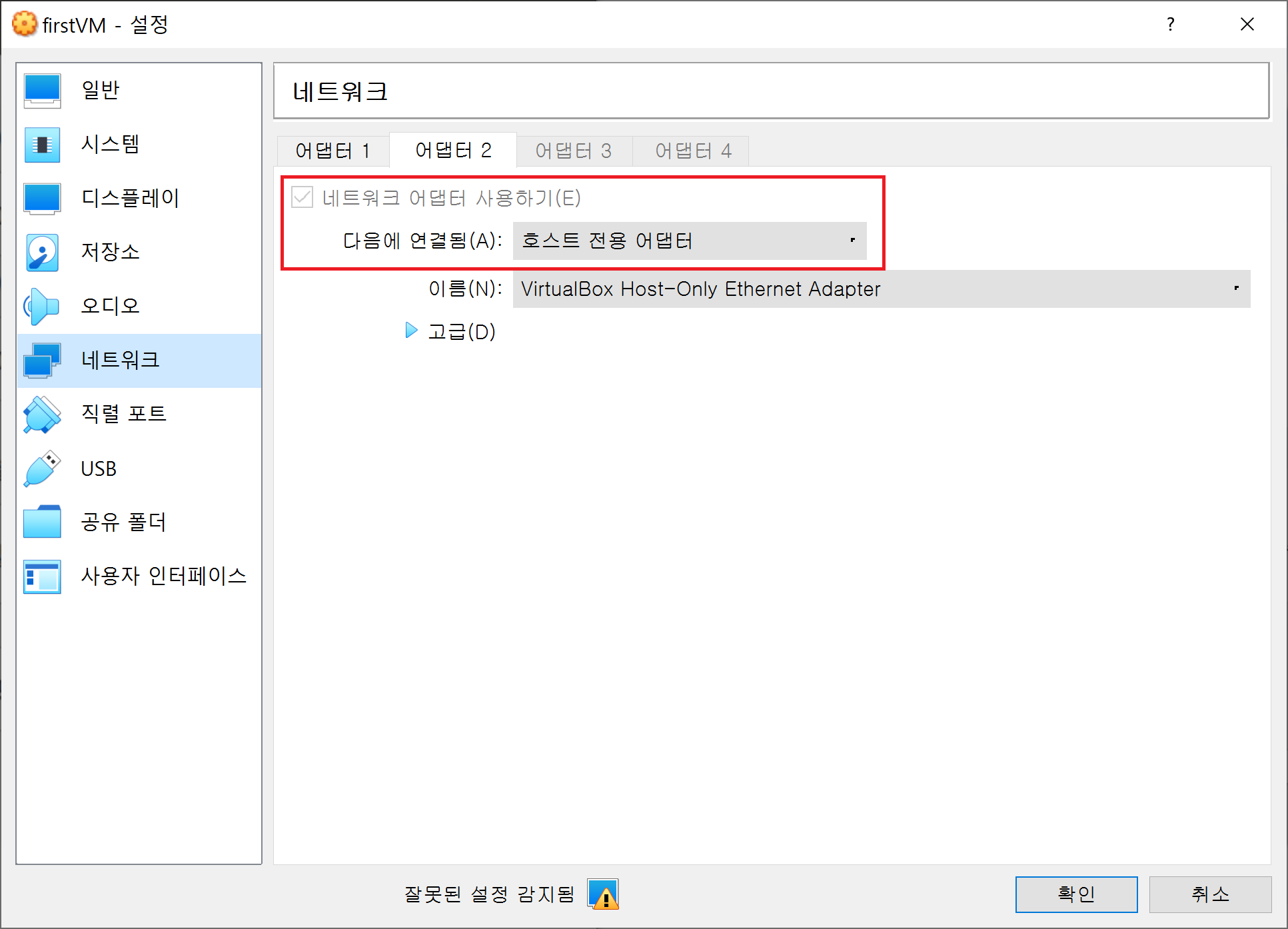 5. enp0s8이 연결이 안 될 경우, Vritual Box 설정이 아래와 같이 되어있는 지 확인한다.