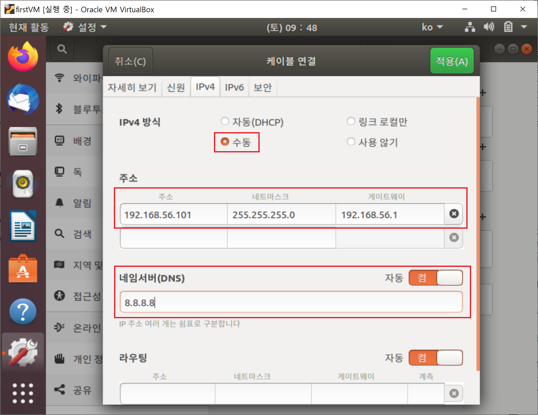 3. enpOs8 :아래와 같이 설정 후 적용.